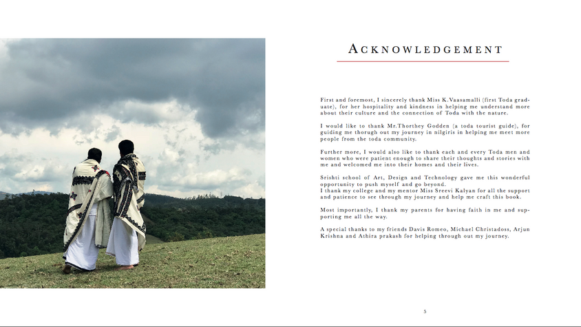 A Coffee table book on the way of life of the Toda Tribes of the Nilgiris. The book takes you through a visual journey which speaks about the lifestyle of the Toda tribe, their ways with nature and their unique embroidery style called 'pugur'. This book is targeted on the tourists people of the Nilgiris, as a coffee table book to create an awareness among people about the tribe .